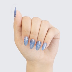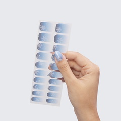 Ombré. Dark blue to white. Rich with shimmer. White snowflake accents. Opaque. Cool undertone.